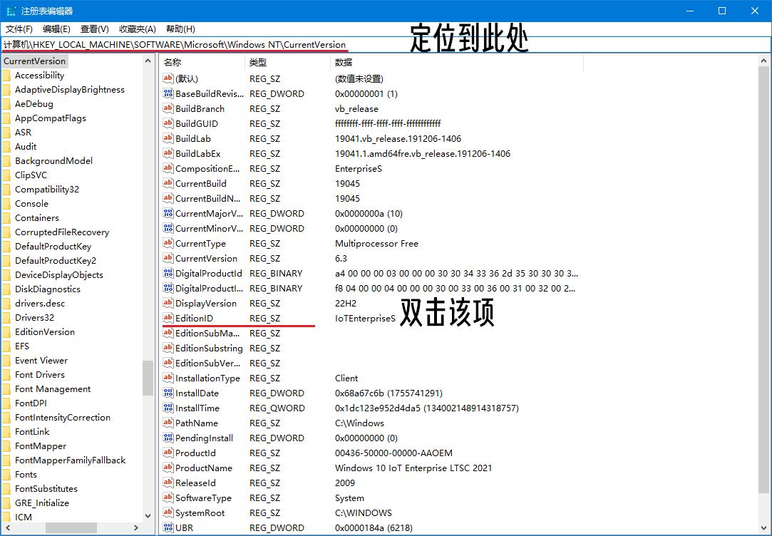 按住 Win 徽标键 + R 组合键,输入”regedit“打开”注册表编辑器“,定位到“HKEY_LOCAL_MACHINE\SOFTWARE\Microsoft\Windows NT\CurrentVersion”。